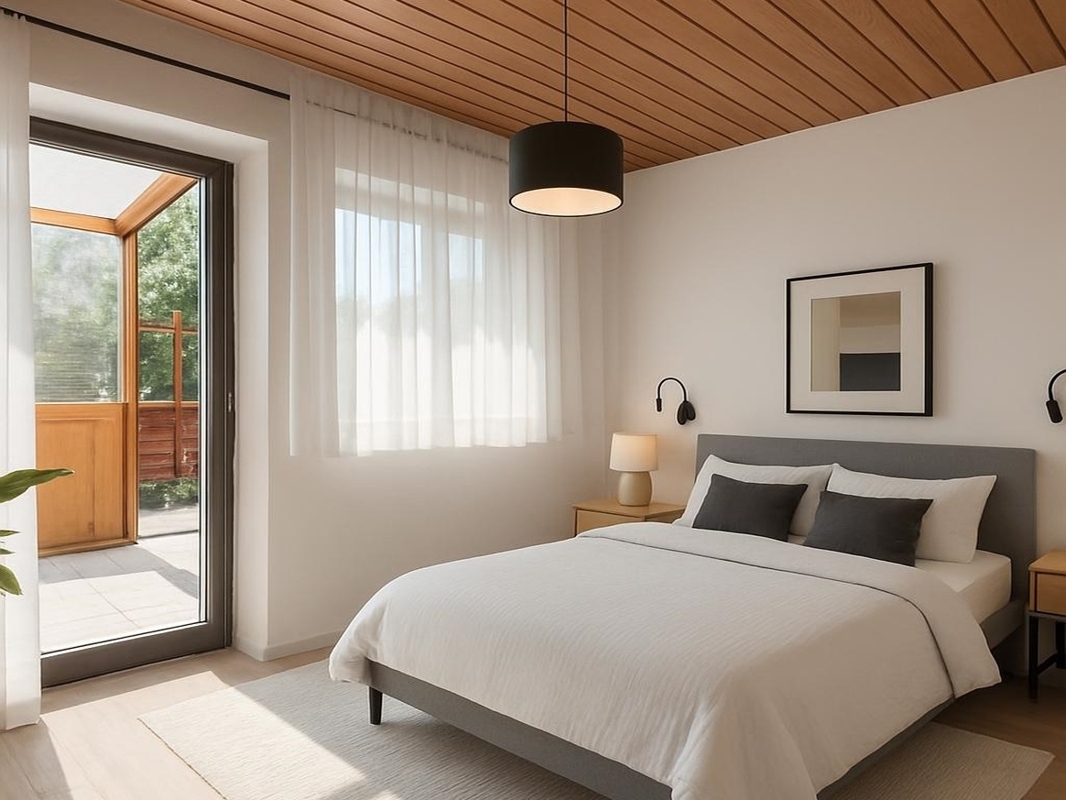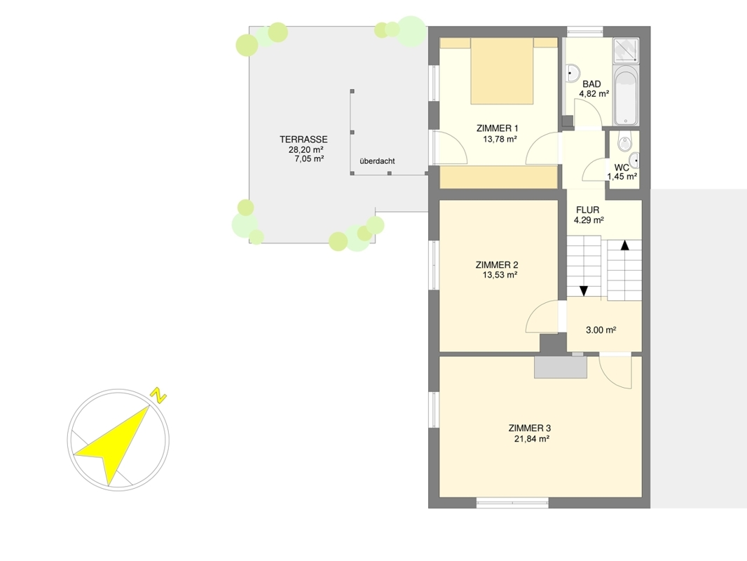 Im Obergeschoss drei Schlafzimmer, eines davon mit Zugang zur großen, teils überdachten Dachterrasse mit herrlichem Blick auf das Schloss.