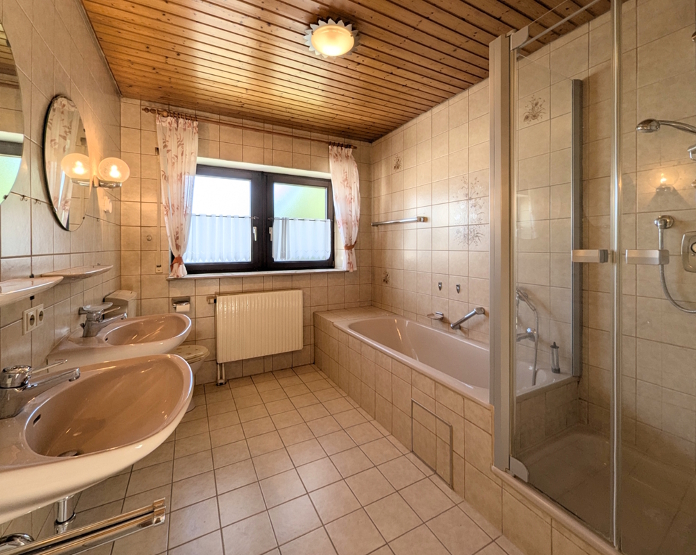 Tageslicht-Badezimmer mit Badewanne und Duschkabine, 2 Waschbecken und WC