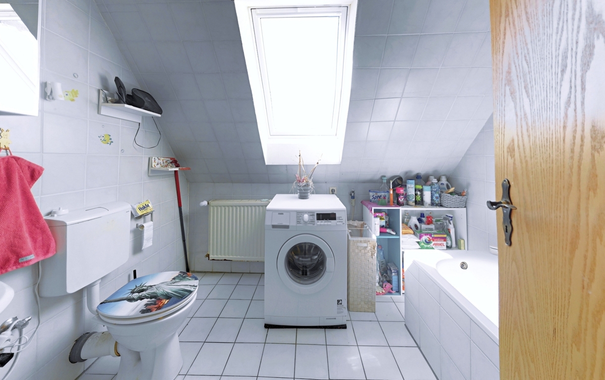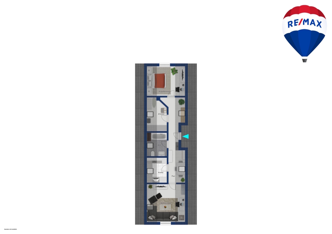 Im Eingangsbereich findet man genug Platz für eine kleine Garderobe. Von hier aus erreichen Sie das geräumige Tageslichtbad, welches mit einer Badewanne, einem Einzelwaschbecken sowie einer Toilette ausgestattet ist. Hier findet ebenfalls die Waschmaschine Platz. Links daneben finden Sie die gut geschnittene, helle Küche. Links im Anschluss an die Diele erreichen Sie den lichtdurchfluteten Wohnbereich. Der Flur, das Badezimmer und die Küche sind gefliest, die drei Zimmer mit Laminatböden ausgestattet, wobei einige beschädigte Stellen vorhanden sind. Das Schlafzimmer bietet Platz für ein Doppelbett und für einige Kommoden.