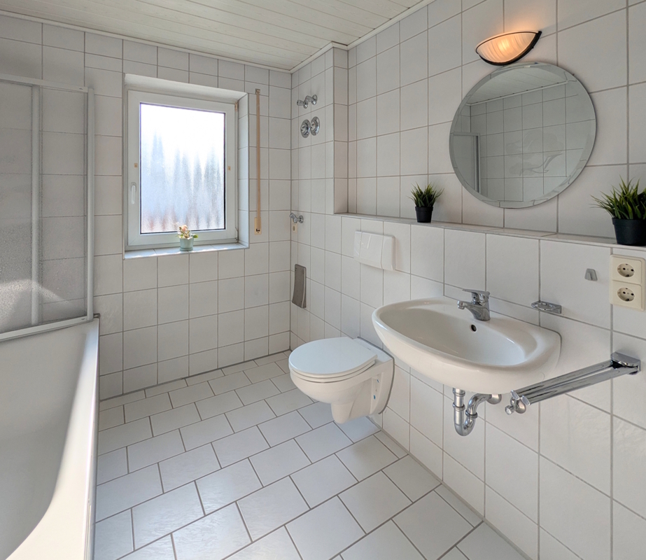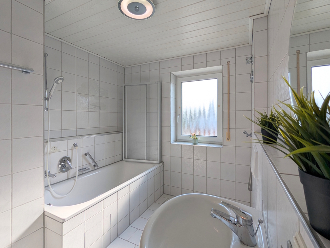 - Tageslicht-Badezimmer mit Badewanne, WC, Waschbecken und Waschmaschinenanschluss