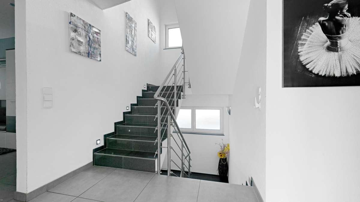 Die Innenausstattung überzeugt durch hochwertige Materialien: massive tragende Innenwände, Fliesenböden im gesamten Haus, Decken-Einbauspots, eine stilvolle gewandelte Treppe aus Stahlbeton sowie Fußbodenheizung in allen Ebenen (inkl. ELW).