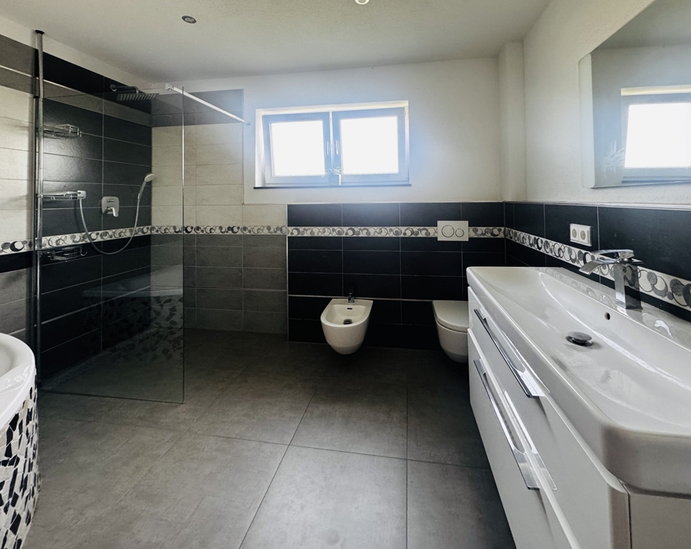 • Großes Bad mit Dusche, Eckbadewanne, Doppelwaschbecken, Bidet & WC