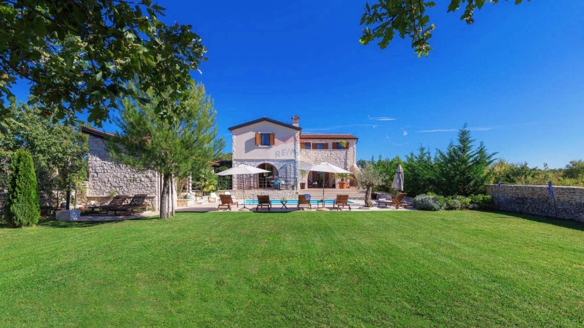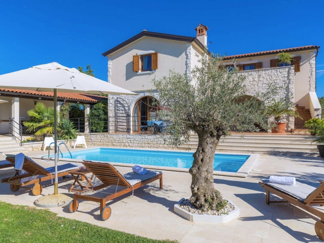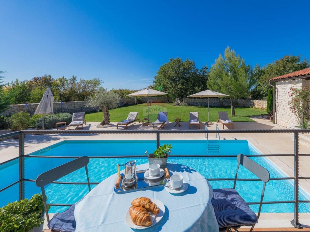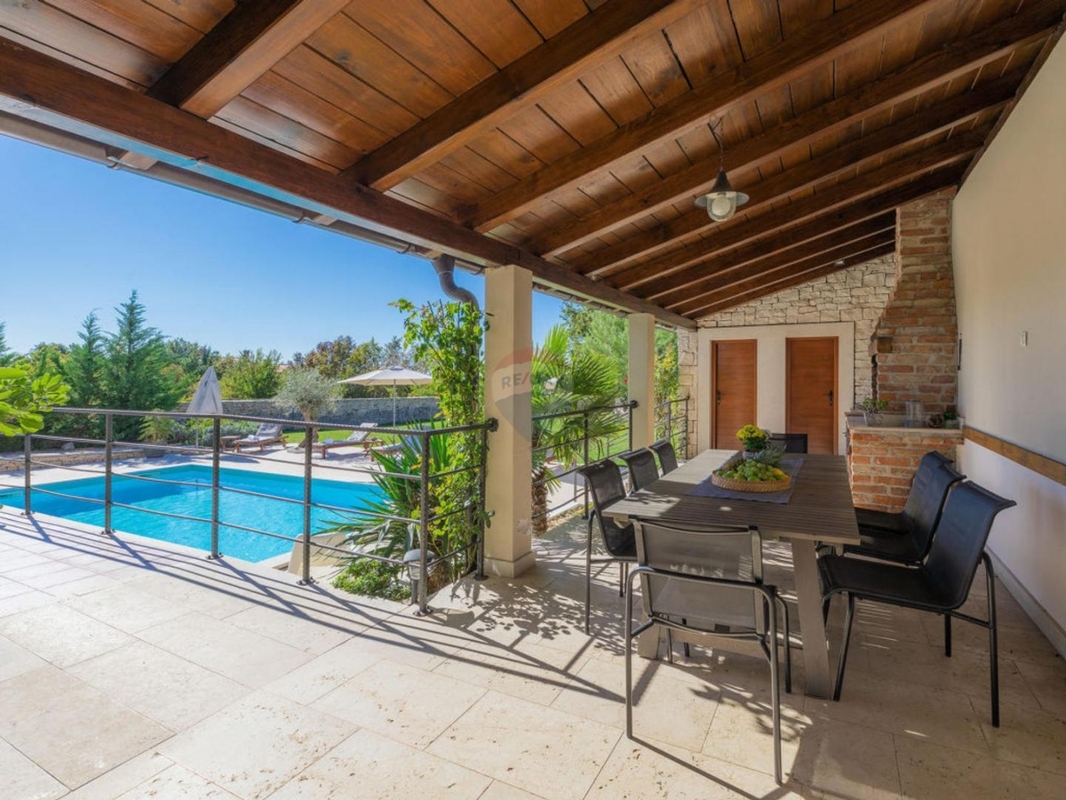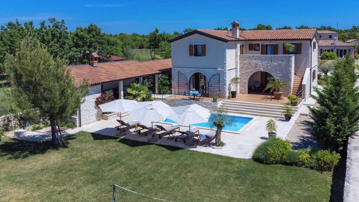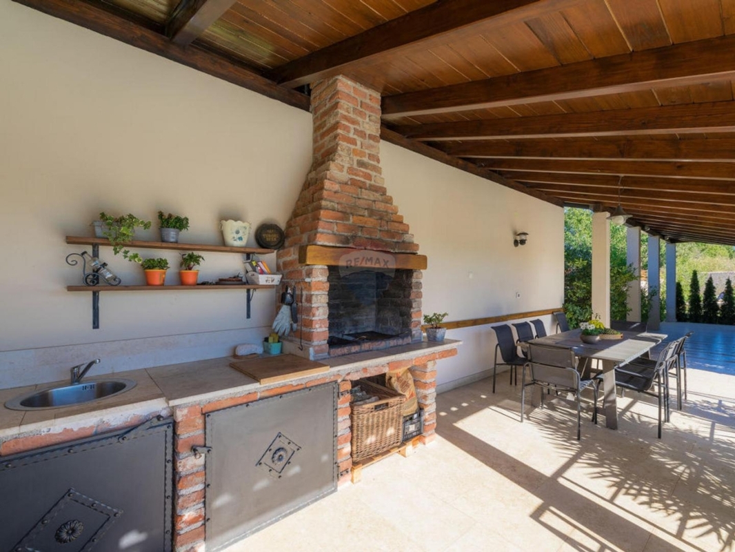 Vor dem Haus haben Sie eine 32 m² großen Pool, eine Sonnen- sowie eine überdachte Terrasse und eine Sommerküche.