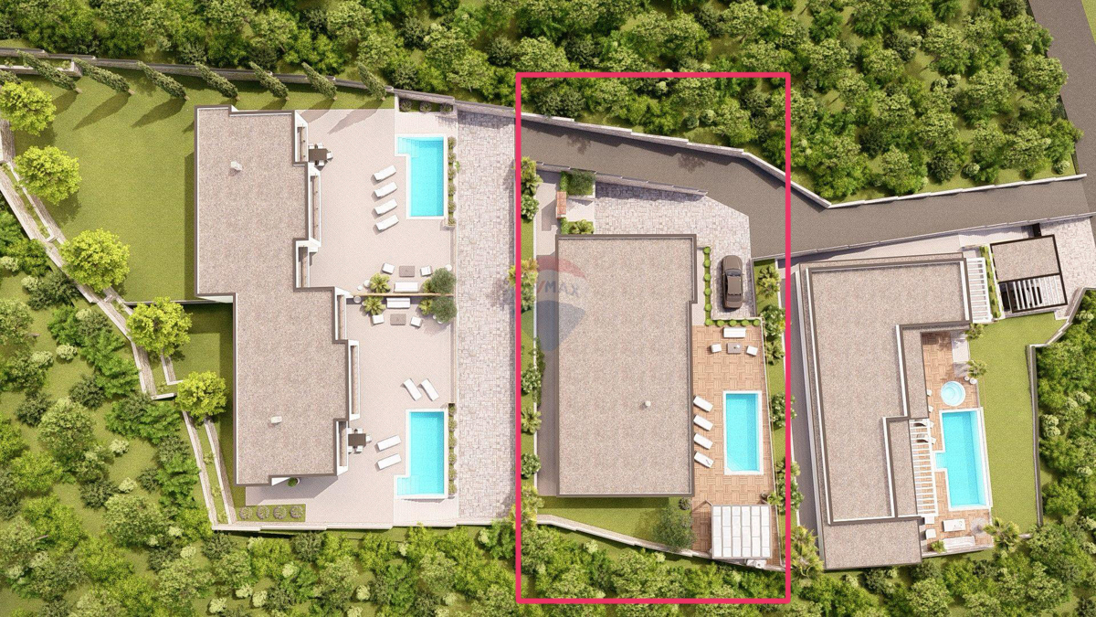 Das etwa 1.000 m² große Grund bietet eine Fläche der Außenanlage von 823 m². Der Außenbereich erstreckt sich über die gesamten Hauslänge. Die große Terrasse um den Pool herum ist mit mehreren Beeten verziert. Eine überdachte Sommerküche sowie Außendusche befinden sich neben dem Pool.