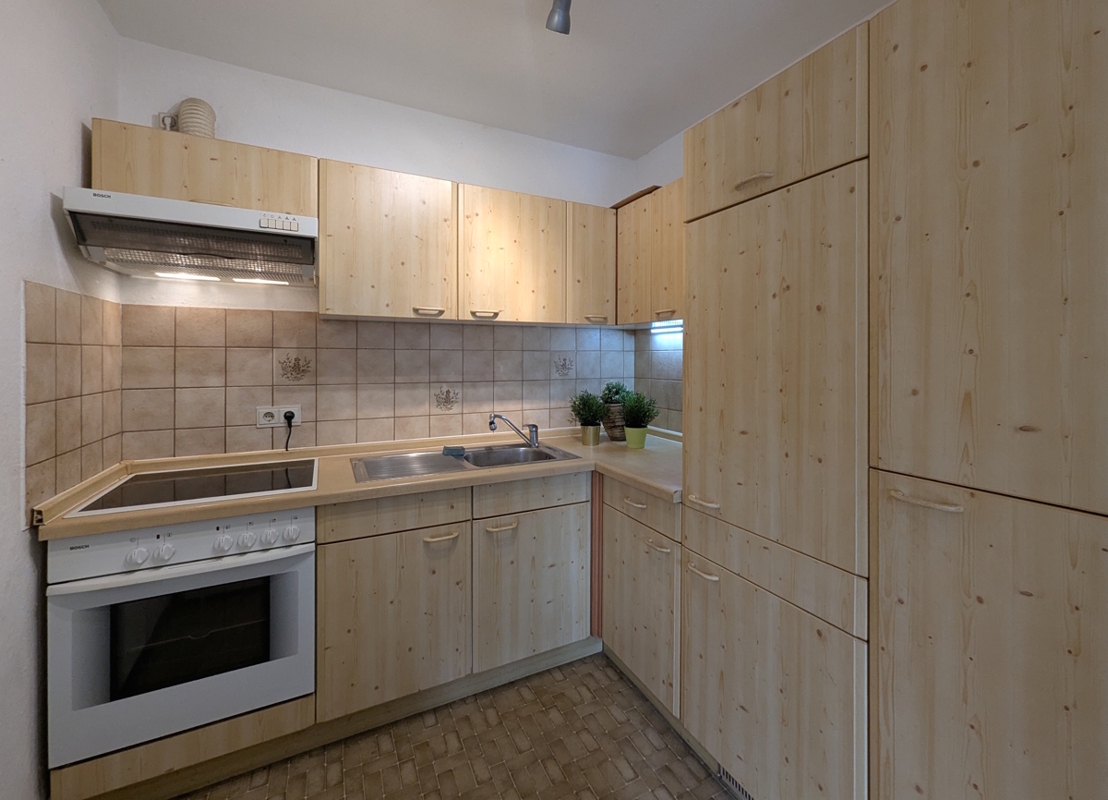 Die Küche ist mit einer Einbauküche ausgestattet und grenzt an das Wohn- und Esszimmer.