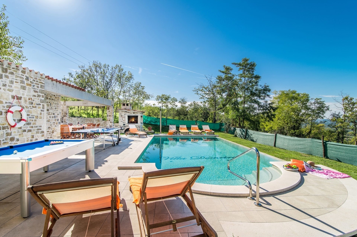 Neben dem 36 m² großen Pool befindet sich auch ein Nebengebäude mit Sauna. Hier haben Sie auch einen schöner Steinkamin-Grill und Sommerküche sowie eine überdachte Terrasse mit Sitzplatz.