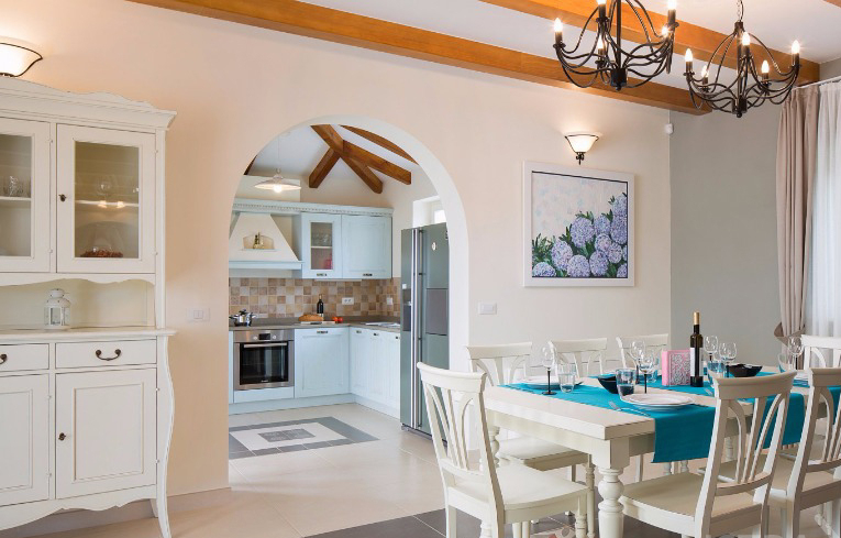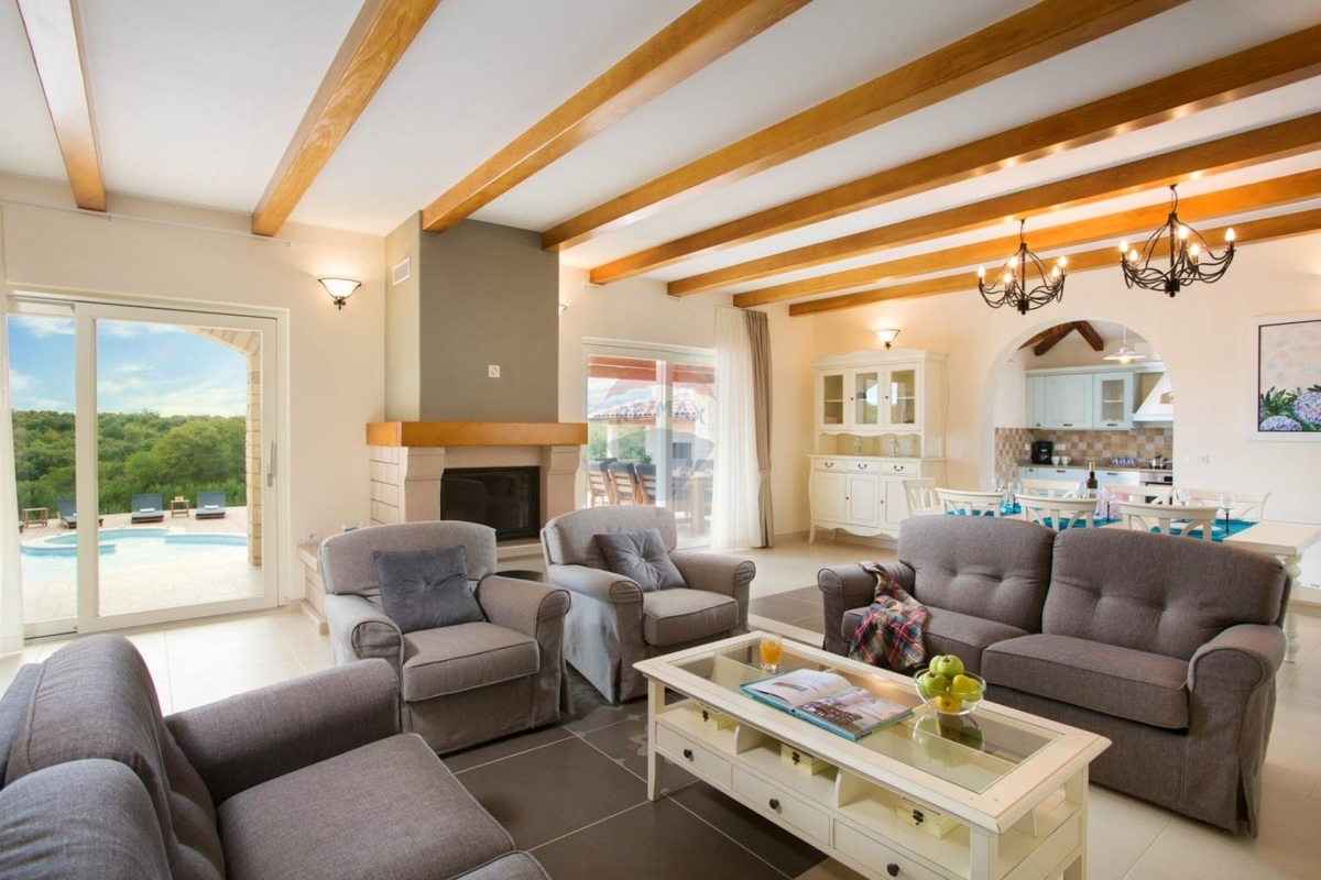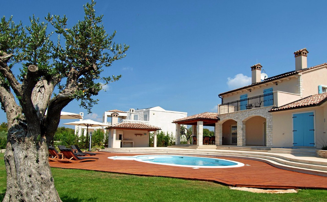 Die Außenanlage ist harmonisch angelegt, mit viel überdachten sowie offenen Flächen sowie einer Sommerküche. Der Pool mit Salzwasser ist etwa 34 m² groß.