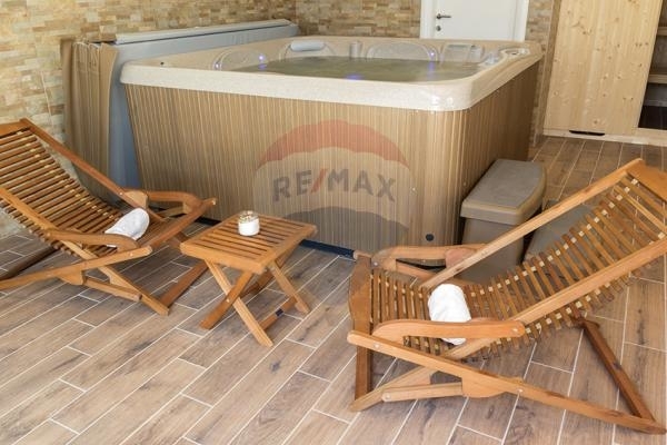 Der Außenbereich bietet neben dem 40 m² großem Pool, Mini Golf, einen Wellnessbereich mit Sauna und Jacuzzi, einen Spielplatz, eine Sommerküche sowie eine Doppelgarage.