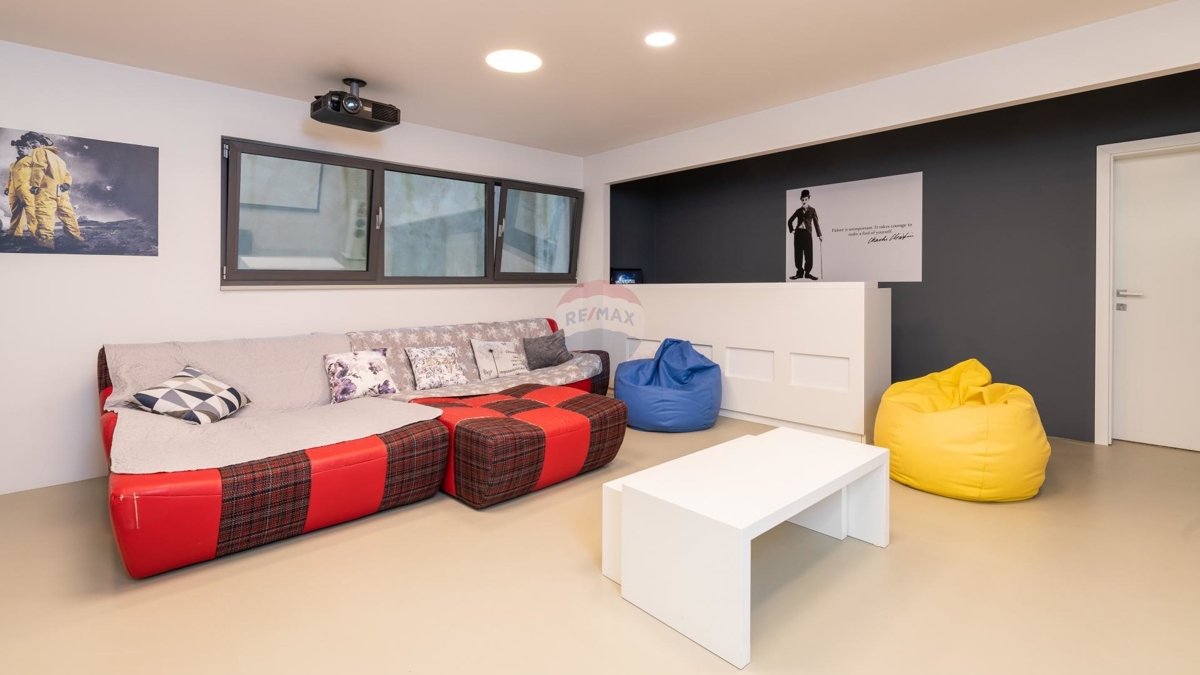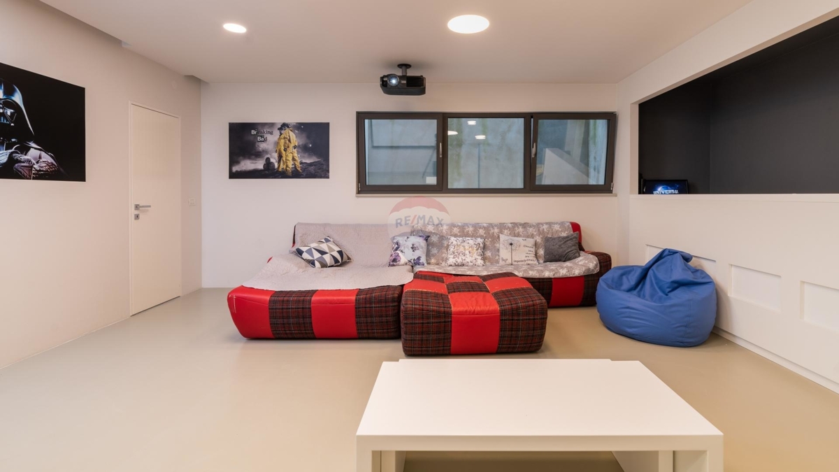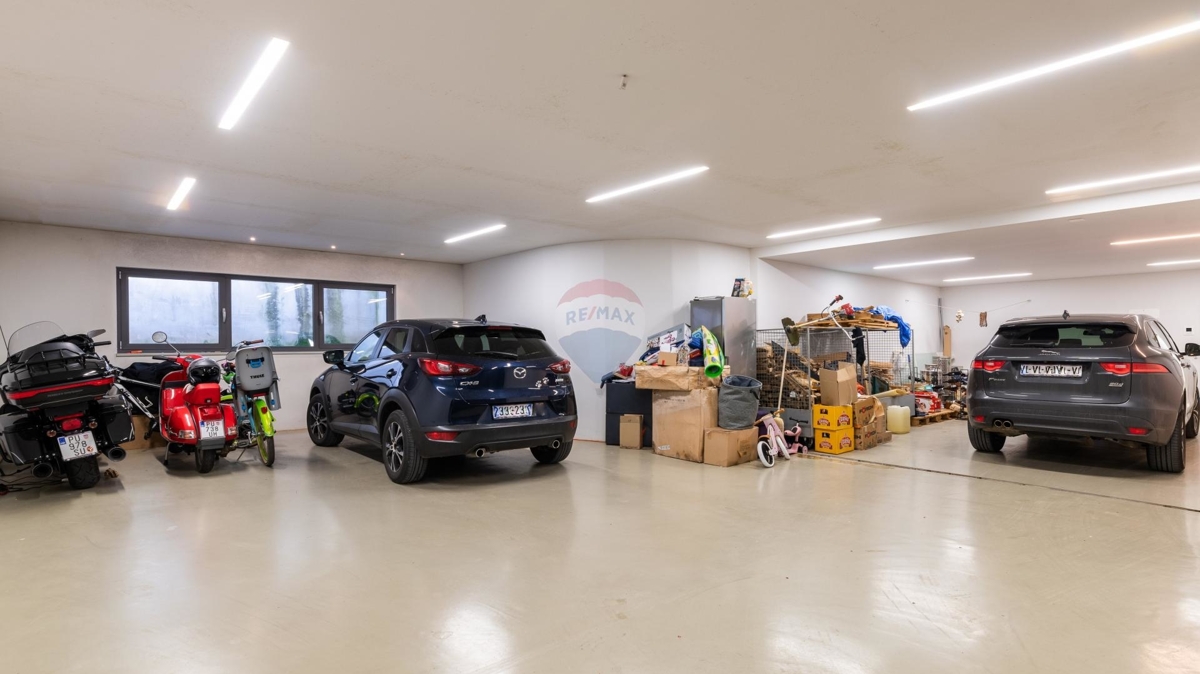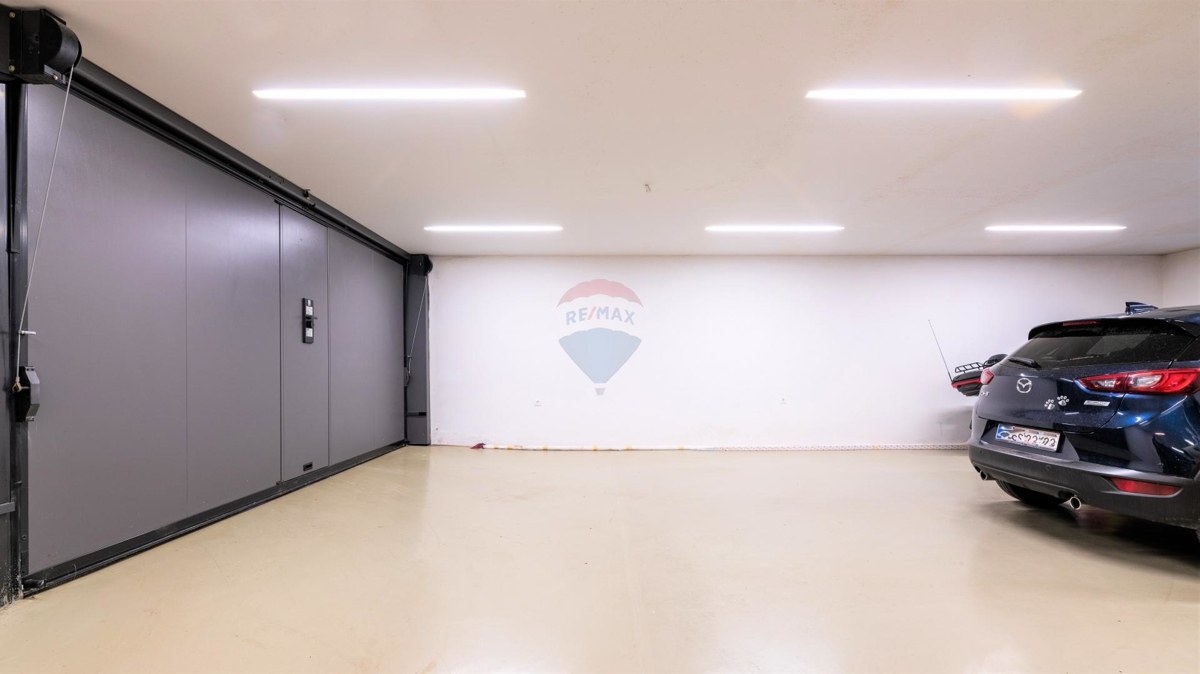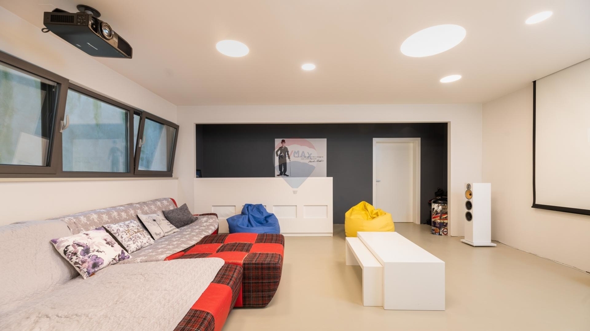 Im Untergeschoss ist ein Kinoraum eingerichtet, mit Leinwand, Beamer und hochwertigem Soundsystem. Die Einbauschränke im Keller bieten viel Stauraum. Desweiteren befindet sich im Keller eine Tiefgarage mit insgesamt vier Stellplätzen.