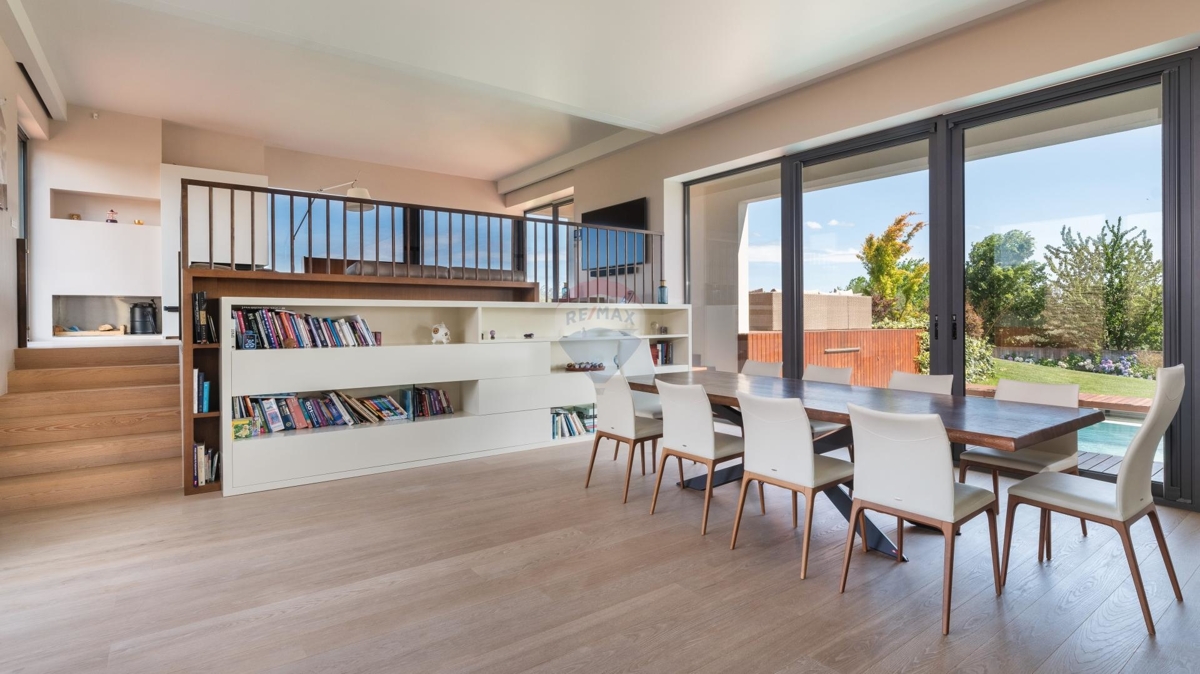 Im Erdgeschoss befindet sich die offene, voll ausgestattete Küche mit Essbereich und direktem Ausgang zum Pool und überdachten Terrasse. Das Wohnzimmer mit Kamin befindet sich einige Stufen höher als die Essküche und trennt somit charmant die Räume. Das Wohnzimmer bietet einen Zugang zu einer Außenlounge sowie zum Garten.