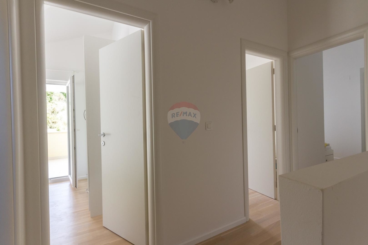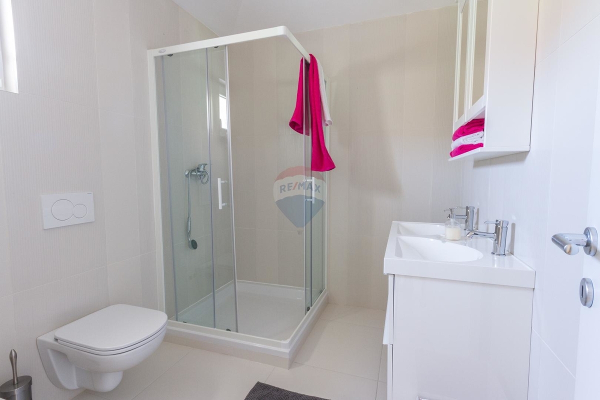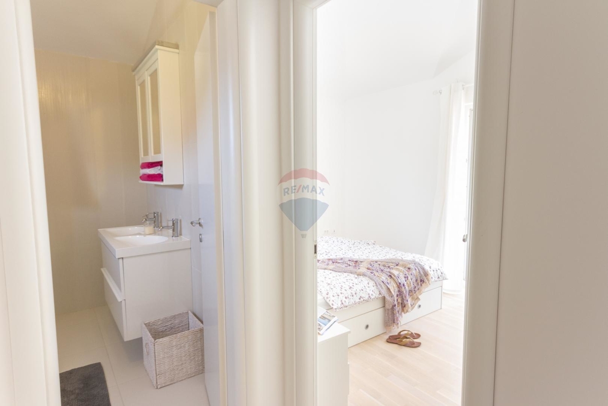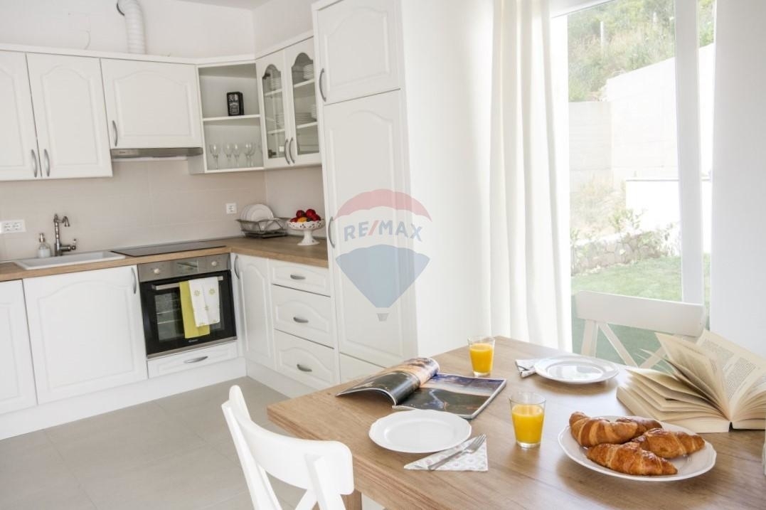 Über zwei Etagen sind die Wohnräume verteilt: Im Erdgeschoss die Küche und Wohnzimmer, Abstellraum und Toilette, im Obergeschoss drei Schlafzimmer, zwei Bäder und ein großer Balkon mit Meerblick.