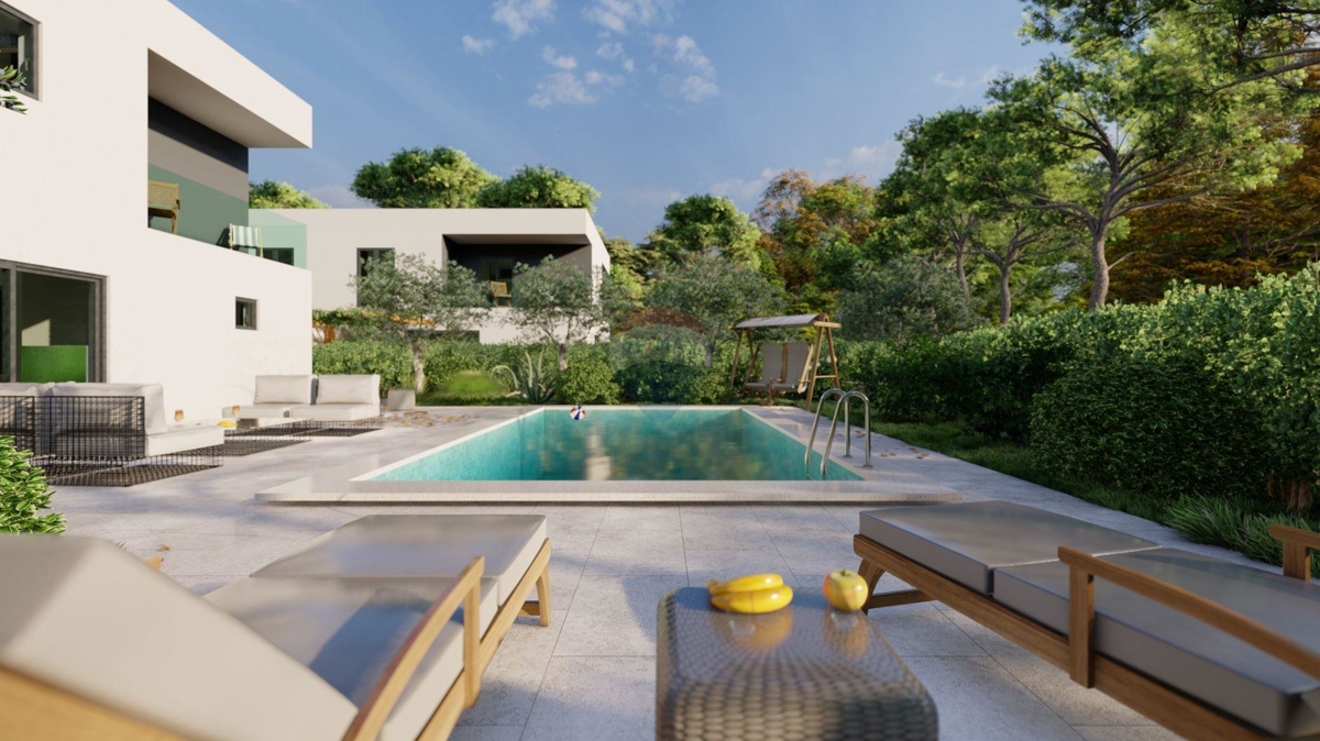 Dieser Neubau wurde 2021 fertig gestellt und überzeugt mit modernem Design in Zentrum- und Meeresnähe.Das Erdgeschoss verfügt über ein schönes, geräumiges Wohnzimmer mit Essbereich, Küche, Bad, Abstellraum, Waschküche und große Terrasse mit Blick auf den Pool.