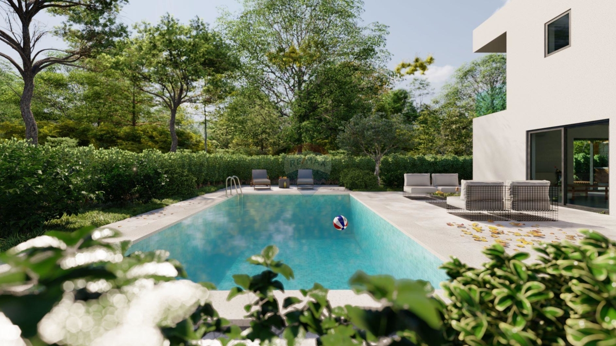 Der Außenbereich bietet einen Pool mit Sonnendeck, eine Sommerküche, einem überdachten Essbereich, bepflanzten Garten mit englischem Gras und Olivenbäumen, zwei Stellplätze vor dem Haus.