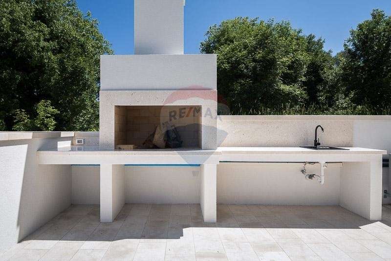 Der Außenbereich ist mit einem beheiztem Pool mit Salzwasser ausgestattet, verfügt über einer Sommerküche mit Grill und einem Parkplatz für 3 PKWs.