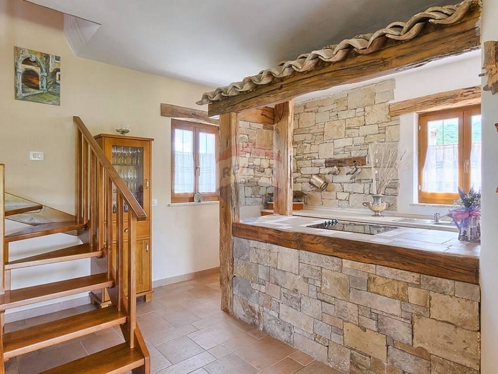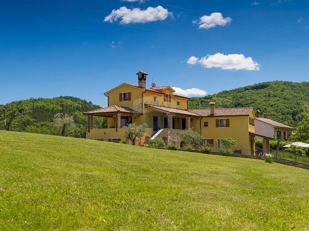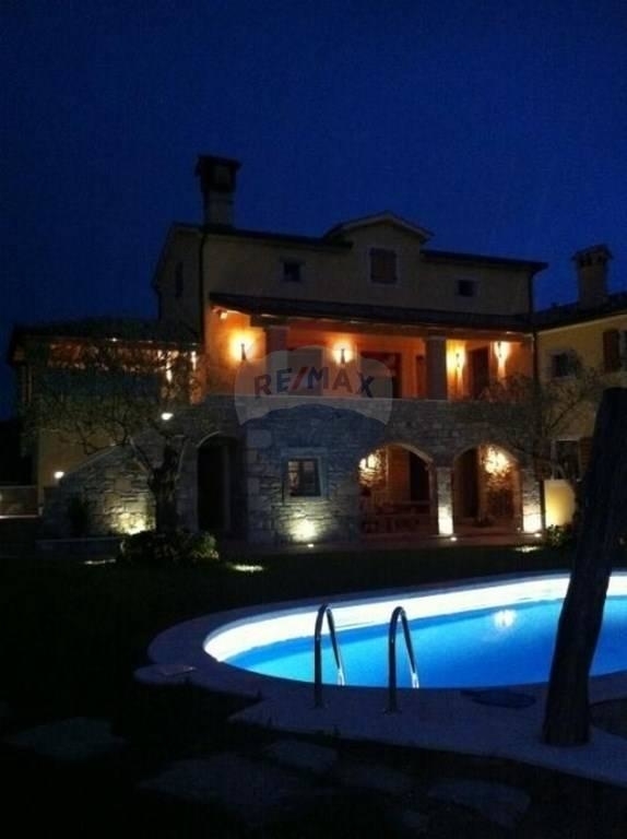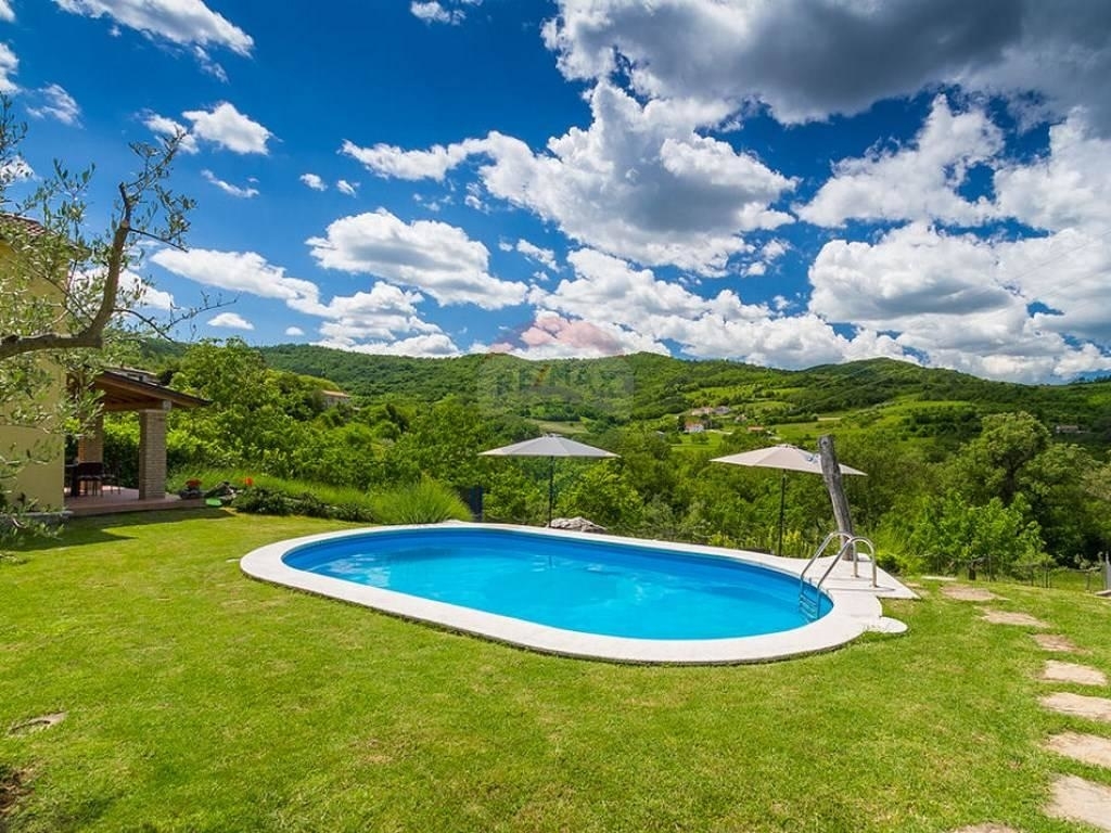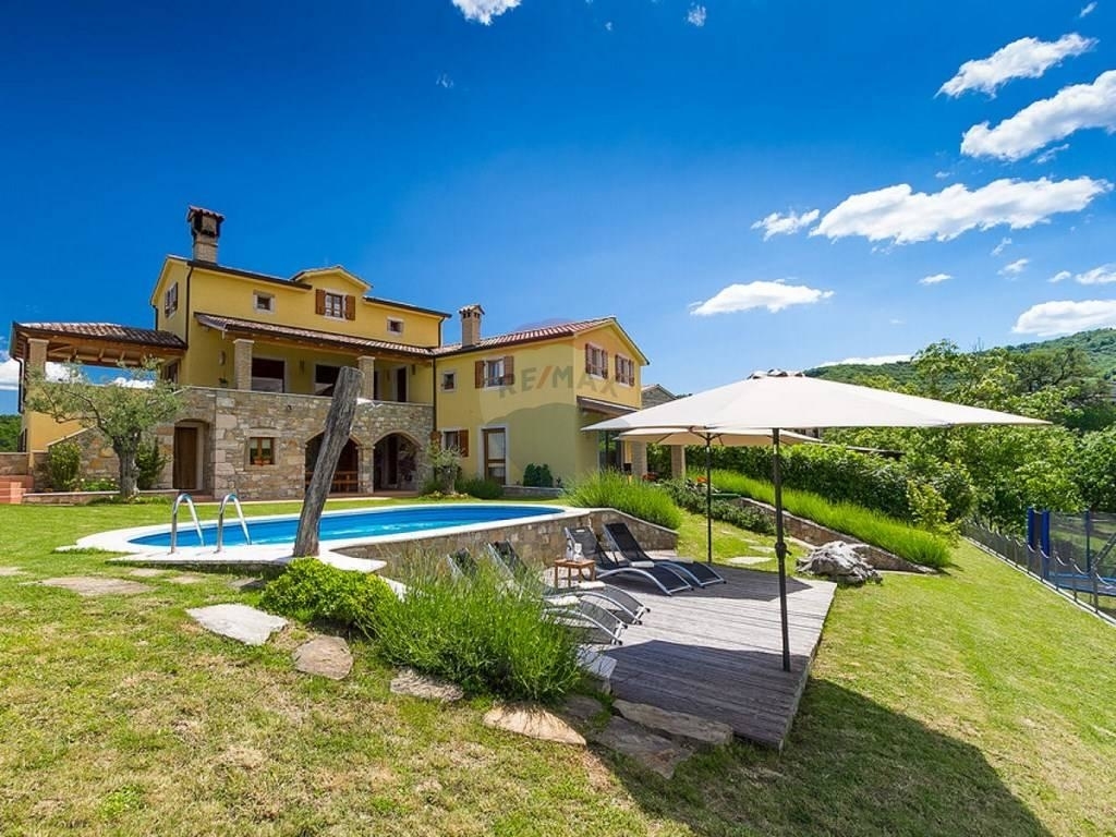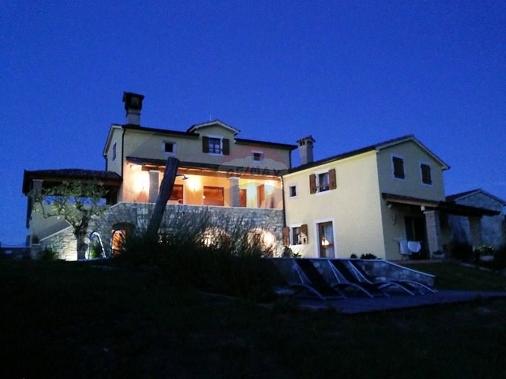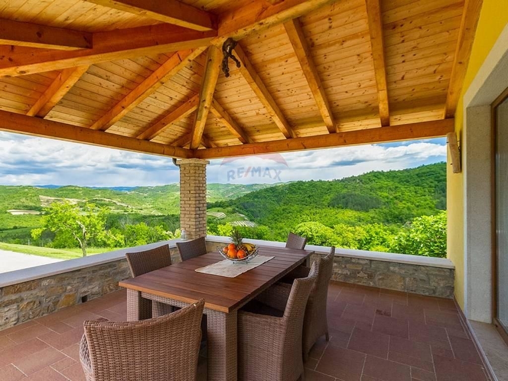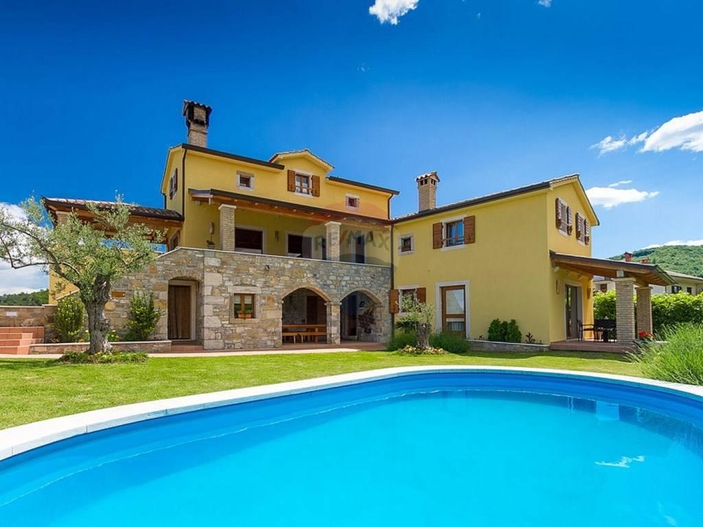 Diese Villa mit charakteristischen Merkmalen eines typischen istrischen Hauses liegt in einer idyllischen Lage im Herzen Istriens und bietet einen wunderschönen Blick auf die schöne Landschaft.Im Erdgeschoss dominiert ein großer, offener Wohn-Ess-Bereich mit Kamin und direktem Zugang zur überdachten Terrasse.