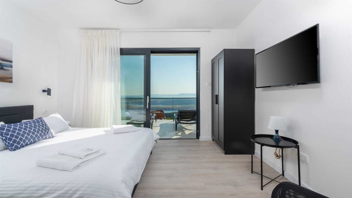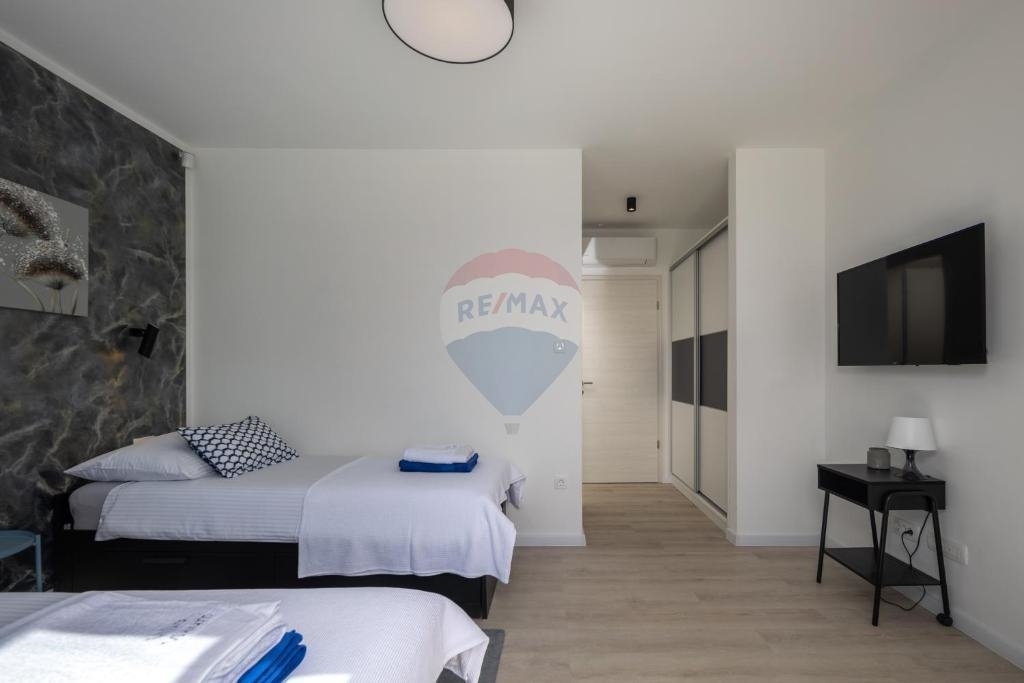Im Obergeschoss befinden sich zwei weitere Schlafzimmer mit eigenem Badezimmer sowie einem Ausgang auf den großen Balkon mit herrlichem offenen Blick aufs Meer und die Insel Krk.