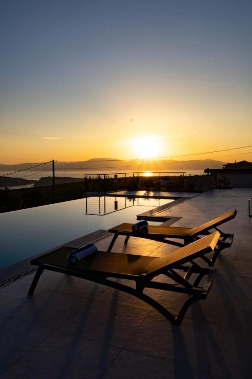 Im Außenbereich befindet sich ein großer Infinity Pool mit Bereich für Klein und Groß und mit Blick aufs Meer. Auf der anderen Seite des Hauses befindet sich ein Kinderspielplatz.