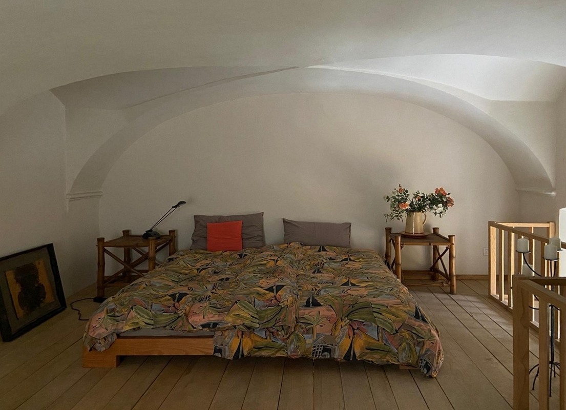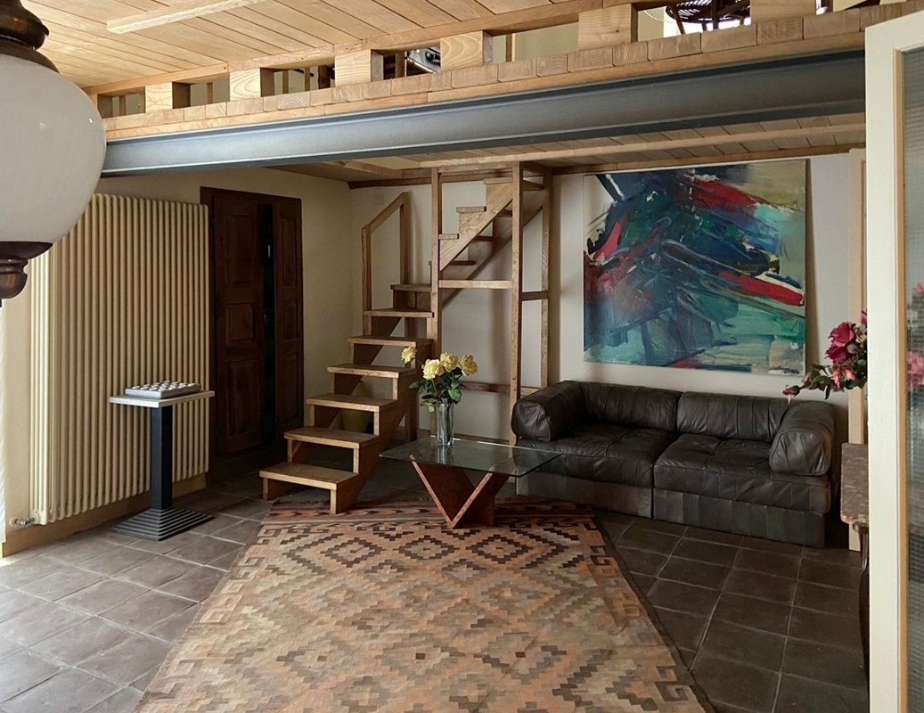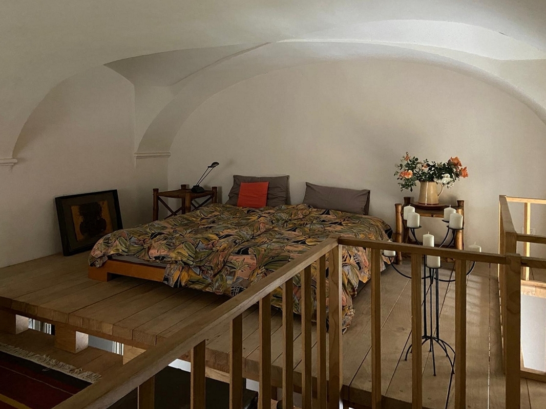 Die großzügigen Räume des Ateliers sind vielfältig nutzbar, der Hauptraum hat eine lichte Höhe von ca. 4,3 m unter einem Gewölbe. In anderen Räumen wurden Zwischengeschosse gebildet, so entstand auch das herrliche Schlafzimmer im Gewölbe.