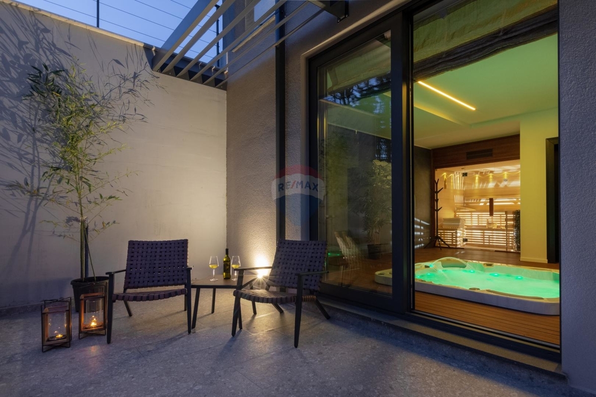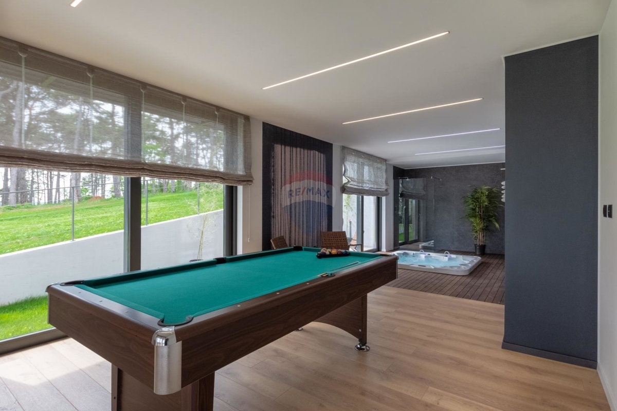 Das Erdgeschoss bietet ein geräumiges Wohnzimmer mit Kamin, dahinter befindet sich die moderne Essküche. Von hier aus gelangt man direkt zur überdachten Terrasse und dem Pool. Ebenso verfügt das Erdgeschoss über einen Wellnessbereich mit Sauna und Whirlpool, sowie einen Billardtisch.