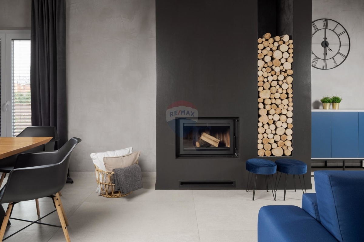 Im Erdgeschoss dominiert ein großer offener Wohn-Ess-Bereich mit gemütlichem Kamin, einem Billardtisch und direktem Zugang zum Außenbereich. Die Küche bietet einen offenen Blick auf den Essbereich.