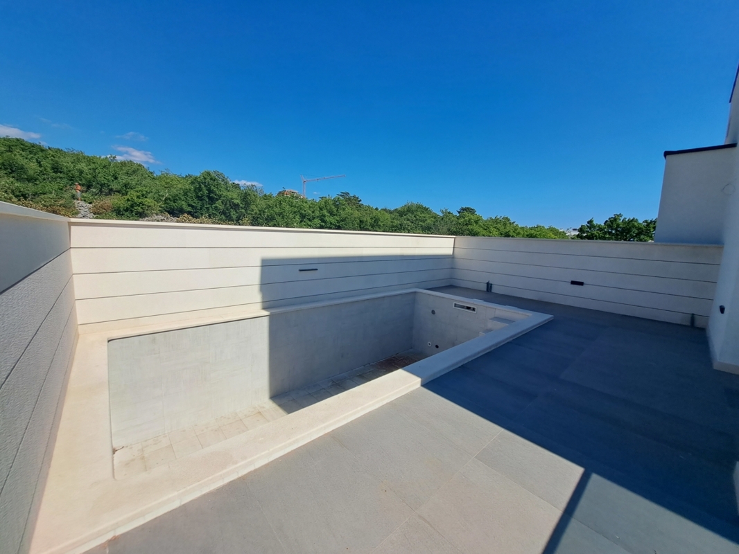 Diese moderne Wohnung befindet sich in einer neu erbauten Villa mit insgesamt vier Wohneinheiten. Jede Wohneinheit sichert Ihnen Privatsphäre sowie einen eigenen Pool.Die Wohnung erstreckt sich auf zwei Etagen. In der ersten Etage befindet sich ein Eingangsbereich, ein offener Wohn-Ess-Bereich mit Küche, ein Schlafzimmer mit Badezimmer und ein Gäste-WC. Vom Wohnzimmer aus gelangen Sie auf die große überdachte Terrasse und zum Außenbereich mit eigenem Pool und einem Steingrill.