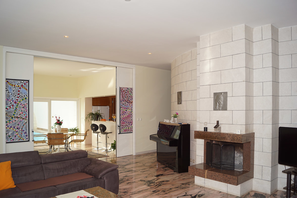 Über die opulente, geschwungene Treppe erreichen Sie das Erdgeschoss. Hier dominiert der offene und helle Wohn- und Essbereich, verbunden mit der großen Küche sowie einem Bar-Bereich, der direkt zum Schwimmbad führt. Von allen Bereichen der Tagesräume gelangen Sie auf die Terrassen und zum Garten. Die Außenküche, mit gemauerten Kamin-Grill ist direkt an die Küche angebunden.