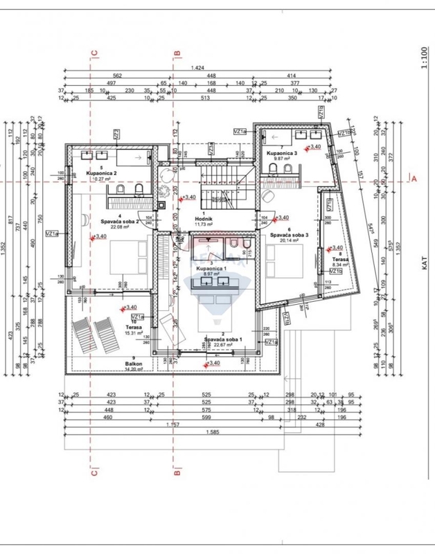 Im Obergeschoss befinden sich drei Schlafzimmer, jeweils mit eigenem Badezimmer und zwei Terrassen.